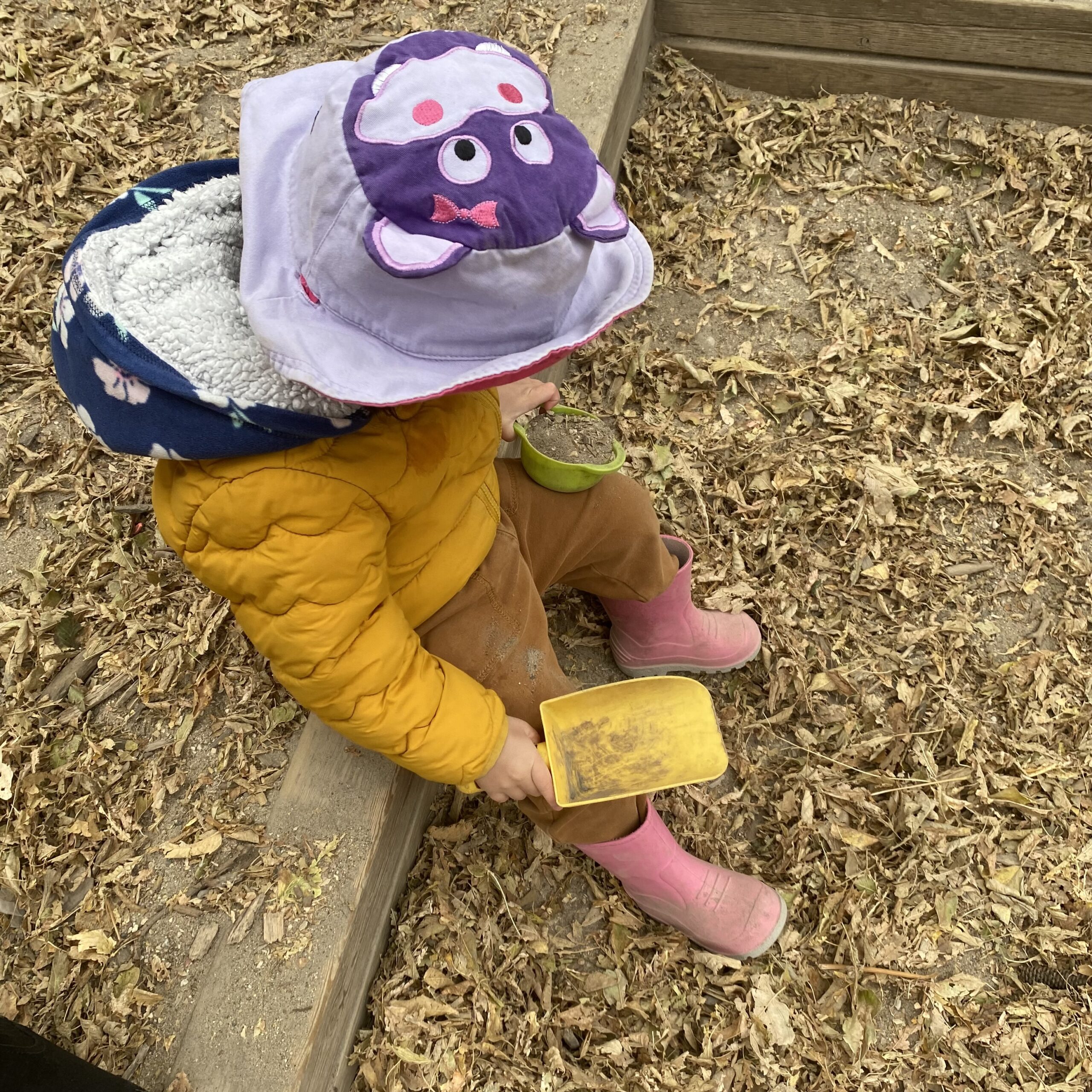 We utilize the home economics and the art room within the school as our main rooms. We have access to the gym as well as a large outdoor space filled with lots of natural materials and a large play structure.
